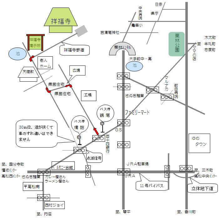 ◎バスの場合は、琴電バス由佐線・御厩線で「橋詰」下車。徒歩10分です。